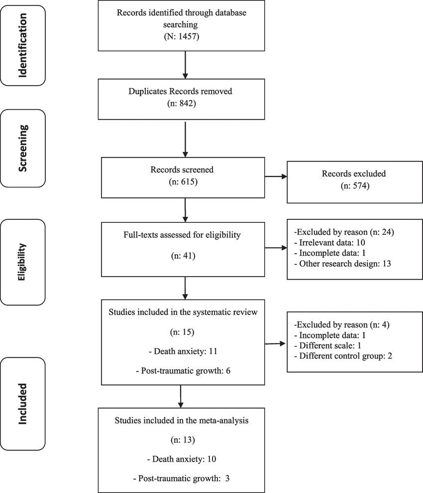 הצגת מודל וניתוח מחקרי סטטיסטי שבוצע על ידי תוכנת STATA גרסה 17. בסה"כ נכללו בסקירה השיטתית 17 מחקרים. 11 מאמרים בחנו את ההשפעה של התערבויות מבוססות משמעות על חרדת מוות ושישה מאמרים בחנו צמיחה פוסט-טראומטית בקרב חולי סרטן.